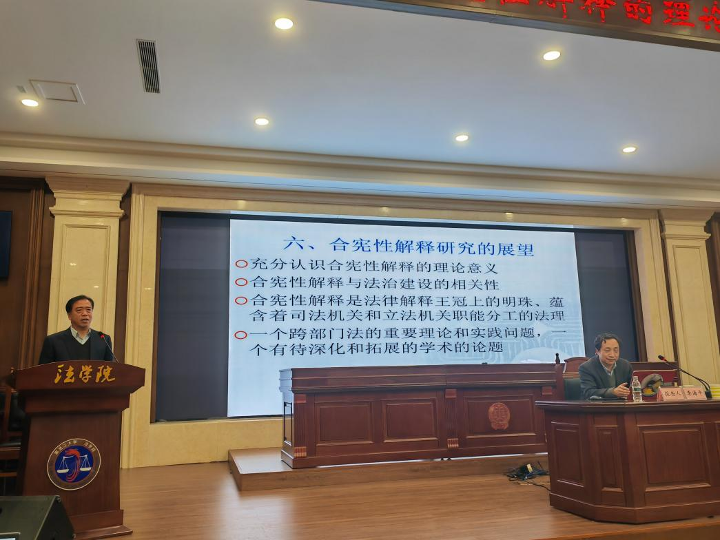 本次学术报告由胡东教授主持,李海平教授对我国合宪性解释理论研究的发展历程和合宪性解释理论研究的争点问题进行了梳理,并结合新时代宪法全面实施的实践,阐释了合宪性解释理论发展的可能路径。200余名师生参加了报告会。
