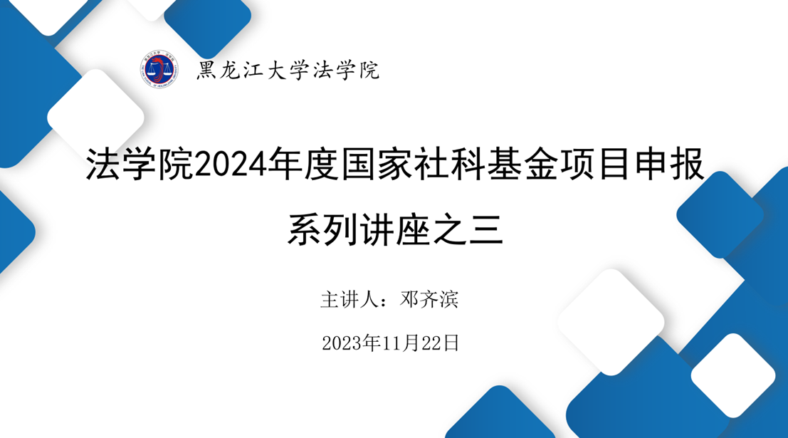 为进一步提高公司教师申报国家社科基金项目的成功率,加强经验交流,提高申报质量,2023年11月22日,公海赌赌船官网jc710在汇文楼835会议室组织召开了2024年度国家社科基金项目申报系列讲座之三。本次讲座邀请公海赌赌船官网jc710邓齐滨教授进行项目申报的经验分享,邓齐滨教授负责的《哈尔滨法制史(1905—1949)》项目,于今年11月成功立项国家社科基金后期资助项目。公海赌赌船官网jc710教师共计二十余人参加讲座。