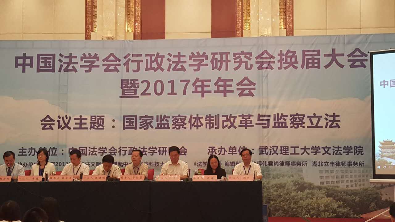 2017年8月26-27日,中国法学会行政法学研究会换届大会暨2017年年会在武汉举行,武汉理工大学文公海赌赌船官网jc710承办了本次年会,会议主题是“国家监察体制改革与监察立法”“城市治理与行政法”,来自全国400余名专家学者参加了研讨。在26日上午举行的研究会换届选举中,公司胡东教授当选为常务理事、哈书菊教授当选为理事。在26日下午举行的第二单元“国家监察体制改革与监察立法”会议研讨中,胡东教授作为评议人,对魏琼教授的《双重改革背景下警察执法争议监督调查的新模式--兼论行政检察监督与监察监督的协调衔接》一文进行了评议。