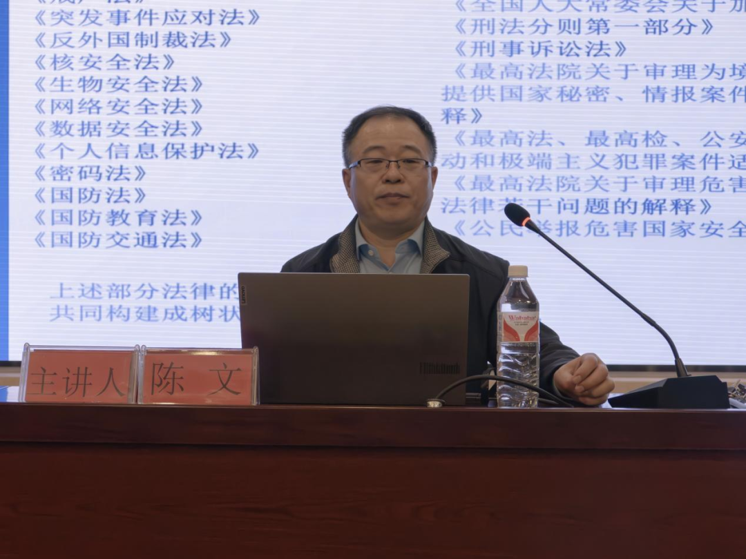 陈文教授首先以国家安全具体案例、表现形式与防范要点为切入点,着重阐述了危害国家安全的行为具有强隐蔽性和普遍性。接着,他从总体国家安全观角度出发,对国家安全进行了法理解读。随后,陈文教授还介绍了我国的国家安全体系构成,从而引入了我国国家安全法律法规体系构成。最后,以《公民举报危害国家安全行为奖励办法》为例,陈文教授强调了公民参与到维护国家安全的实践中来的必要性和重要性,详细阐述师生在日常生活中能够采取的具体行动,鼓励大家积极投身到维护国家安全的行动中来。