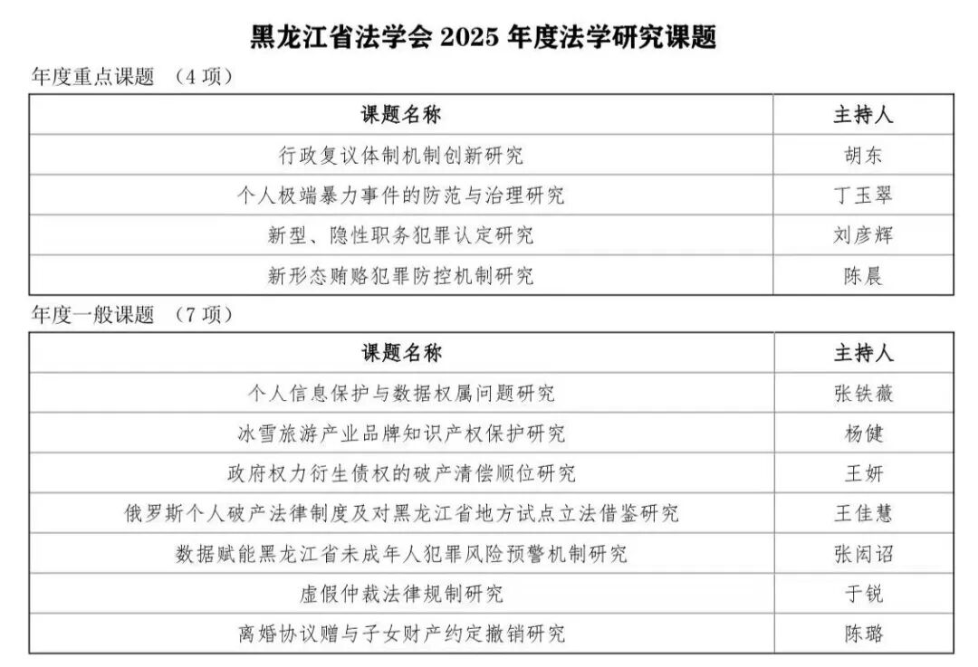近日,在黑龙江省法学会2025年度课题立项中,公司再创佳绩,共获批11项课题。其中,胡东教授主持的《行政复议体制机制创新研究》、丁玉翠副教授主持的《个人极端暴力事件的防范与治理研究》、刘彦辉教授主持的《新型、隐性职务犯罪认定研究》、陈晨副教授主持的《新形态贿赂犯罪防控机制研究》获立年度重点课题。张铁薇、杨健、王妍、王佳慧、张闳诏、于锐、陈璐等7位老师主持的课题获立年度一般课题。