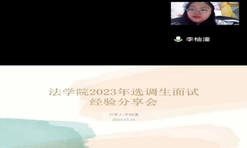 会议中,李柚潼首先向同学们表示了祝贺,并为大家简要地介绍了选调生面试与公务员面试的区别。接着从面试现场人员分配情况、着装举止、考题情况及答题的注意事项等几个方面与同学们进行了深度分享和交流,同时提醒同学们面试中须礼貌自信,不要泄露个人信息。最后,李柚潼与同学们进行互动交流,并对大家现场提出的问题做出了细致的解答,同学们纷纷表示收获满满。