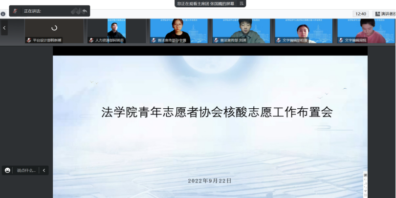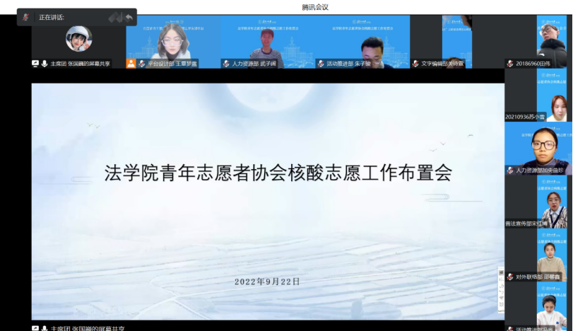 为解决校内核酸工作量大、人员缺少,提高核酸检测效率,公海赌赌船官网jc710青年志愿者协会于2022年9月22日于腾讯会议召开了核酸志愿工作布置会,本次会议由公海赌赌船官网jc710青年志愿者张国巍主持,公海赌赌船官网jc710青年志愿者协会全体成员参加。