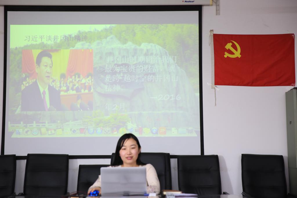 会上,魏双老师通过丰富的纪实照片、详实的历史资料,全景重现了井冈山斗争的一幕幕,并深刻讲解了井冈山精神的内涵,她谈到“星星之火,可以燎原”,井冈山精神是井冈山时期留给我们最为宝贵的财富,党的十八大以来,尤其是党的十八届六中全会以来,“从严治党”是重要而明确的主题,新的历史时期下,如何将以井冈山精神为代表的革命精神与党的建设相结合,扎实开展“两学一做”学习教育具有重要的现实意义。魏老师还谈到,我们要珍惜当下,不忘初心,艰苦奋斗,学习“舍小我,为大家”的革命精神,坚定理想信念,更好地践行“两学一做”。