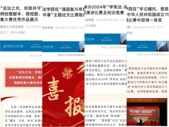 奋斗,是青春的底色;校园,是探索的沃土。自开学以来,24级新生踊跃参与院校两级学风建设活动,积极投身于“庆祝中华人民共和国成立75周年”主题演讲比赛、“学宪法 讲宪法”主题演讲比赛及知识竞赛,以及法律案例创意微短剧、宣传视频、脚本大赛等系列赛事。同学们热情参与,累计三百余人加入到各种活动中,报名参与率达到了100%。在这些活动中,新生们展现了深厚的人文素养,充分体现了对法律知识的深刻理解和掌握。通过团队协作和创新表达,他们锻炼了法律思维、沟通技巧和创新精神。他们以满腔的热情奔赴法治和国家,以实际行动诠释新时代法律精神,用青春笔触描绘了未来法治蓝图。
