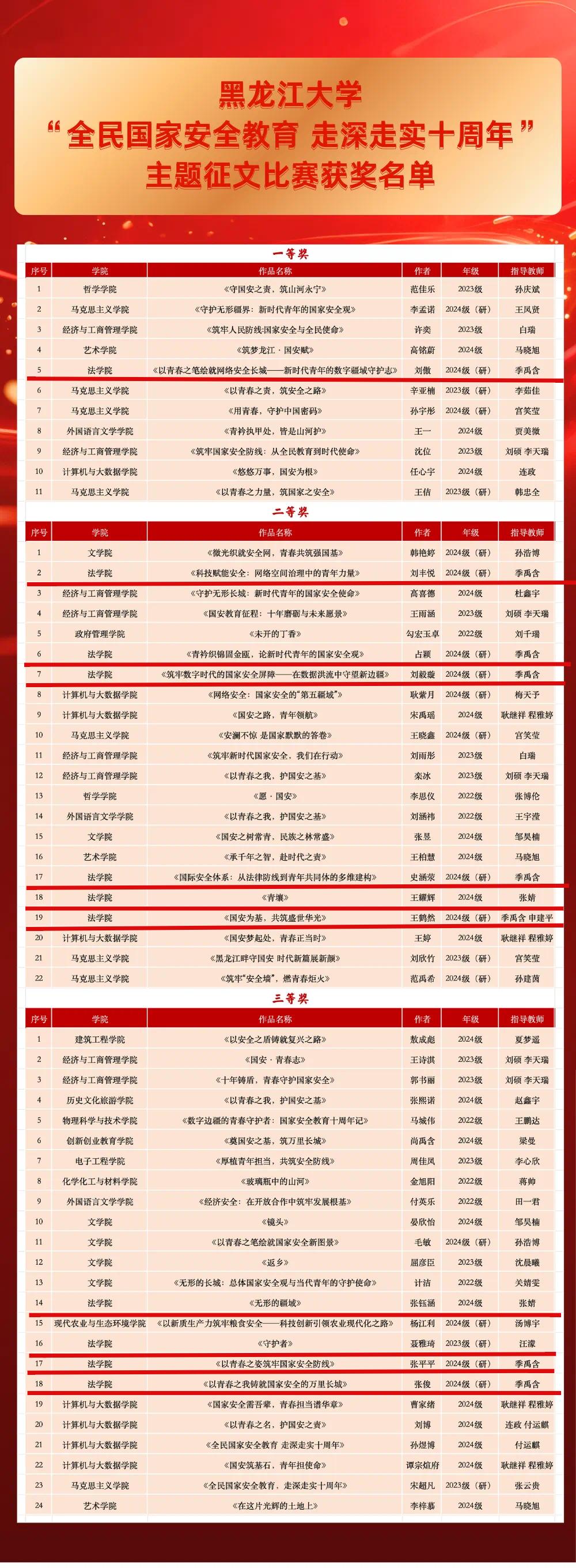 在此,向所有获奖同学致以最热烈的祝贺。他们用文字传递国家安全理念,用笔墨凝聚守护力量,为我们树立了优秀榜样。希望各位获奖同学以此为新起点,继续深耕创作,同时,也号召全体同学以获奖同学为标杆,不断强化国家安全意识,将维护国家安全的使命融入日常,共同为筑牢国家安全防线添砖加瓦。