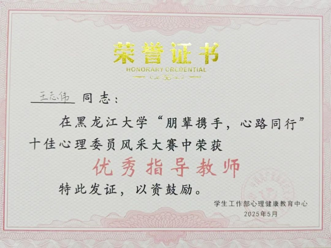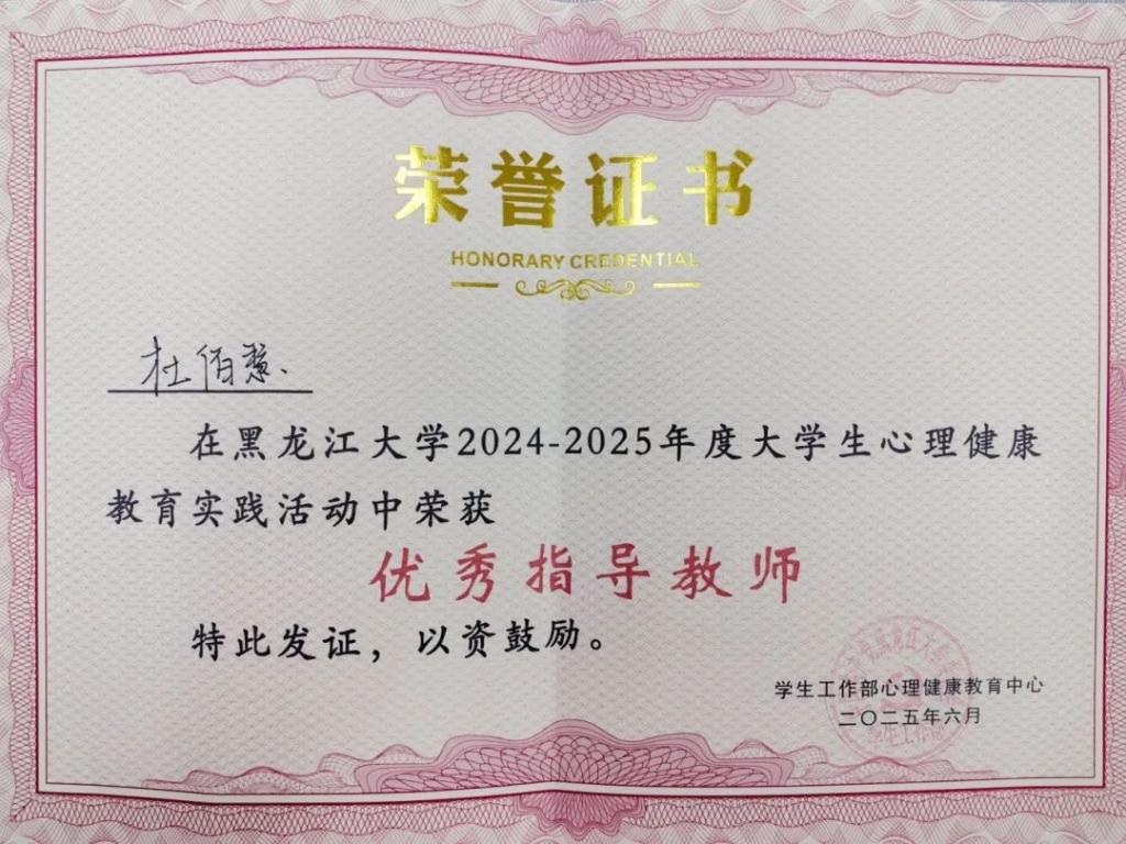 在2024-2025学年心理健康教育实践活动中,公司教师指导员工积极参加各类心理健康教育比赛,助力法律与心理的有机结合,为员工心理健康保驾护航,其中杜佰慧老师依托其在活动参与和指导过程中的突出表现,荣获2024-2025学年心理健康教育实践活动“优秀指导教师”、第十三届“演绎心世界”校园心理情景剧大赛“优秀指导教师”荣誉称号,王志伟老师在其卓越的专业能力和对员工的耐心指导的支持下,荣获“朋辈携手,心路同行”十佳心理委员风采大赛“优秀指导教师”荣誉称号。