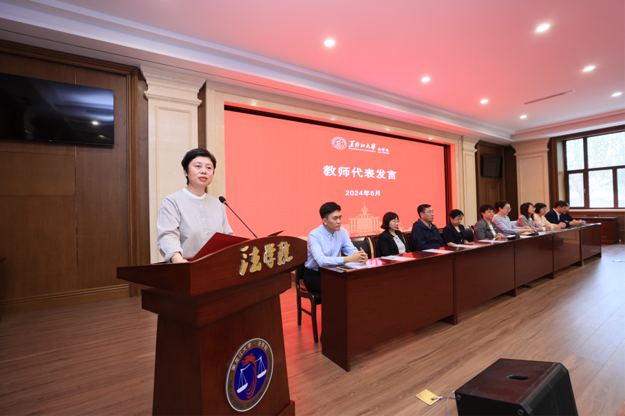 法理学教研室李丹丹老师代表全体老师发言。她亲切的话语中寄寓着对毕业生们的殷切期望与温暖叮咛,并且鼓励同学们努力做一名终身的学习者、幸福的普通人和正义的维护者,希望同学们与时俱进、知足常乐,在新的征程中成就自我梦想、实现自我价值。