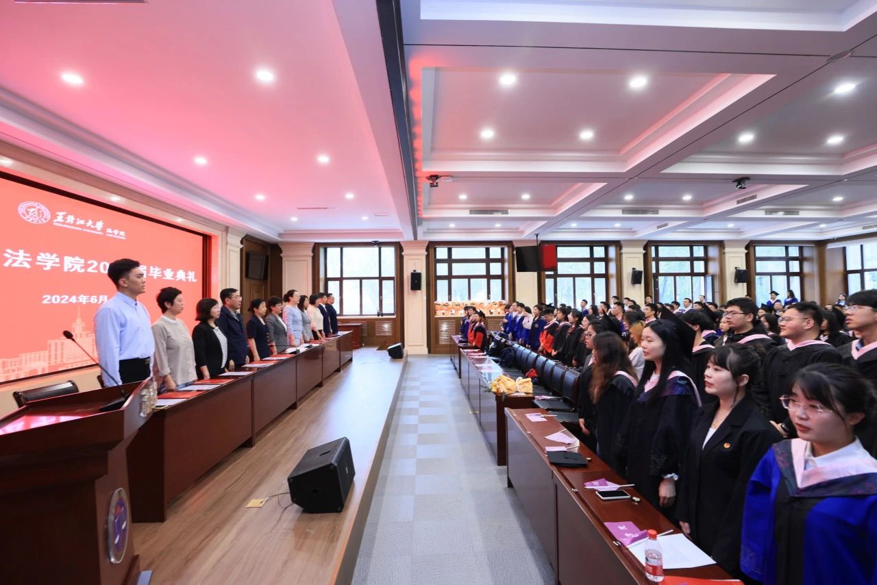随着庄严的国歌声响起,全体起立,合唱国歌。2024届毕业生毕业典礼正式开始。