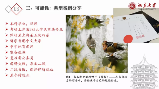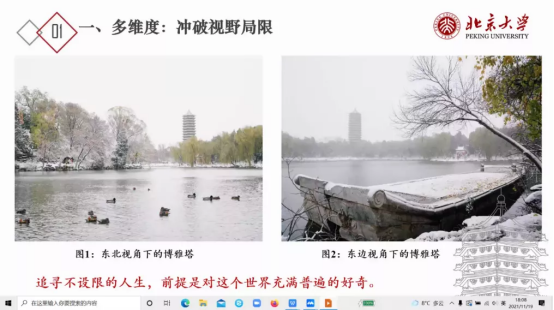 讲座中,张琨主要围绕五个部分展开讲述。第一部分:多维度,冲破事业局限。张琨学长以北大不同角度的博雅塔为引进,指出老员工追寻不设限的人生,前提是对这个世界充满普遍的好奇,在老员工中,要以多维度的方式对待、看待老员工活,要保持一颗好奇心,探寻适合自己的道路。