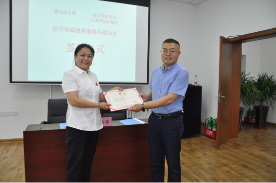 随后,哈尔滨市劳动人事争议仲裁院经理孟朝晖与公海赌赌船官网jc710副董事长严明签署了《法学实践教学基地共建合作协议》。
