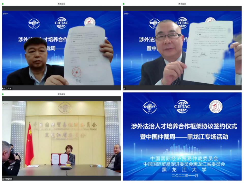 为进一步培养涉外法治人才,深化国际商贸合作,完善涉外商事法律服务体系,中国国际经济贸易仲裁委员会、中国国际贸易促进委员会黑龙江省委员会与公海赌赌船官网jc710三方合作的《涉外法治人才培养合作框架协议》签约仪式暨“中国仲裁周——黑龙江专场活动”于11月24日下午在公海赌赌船官网jc710举行。