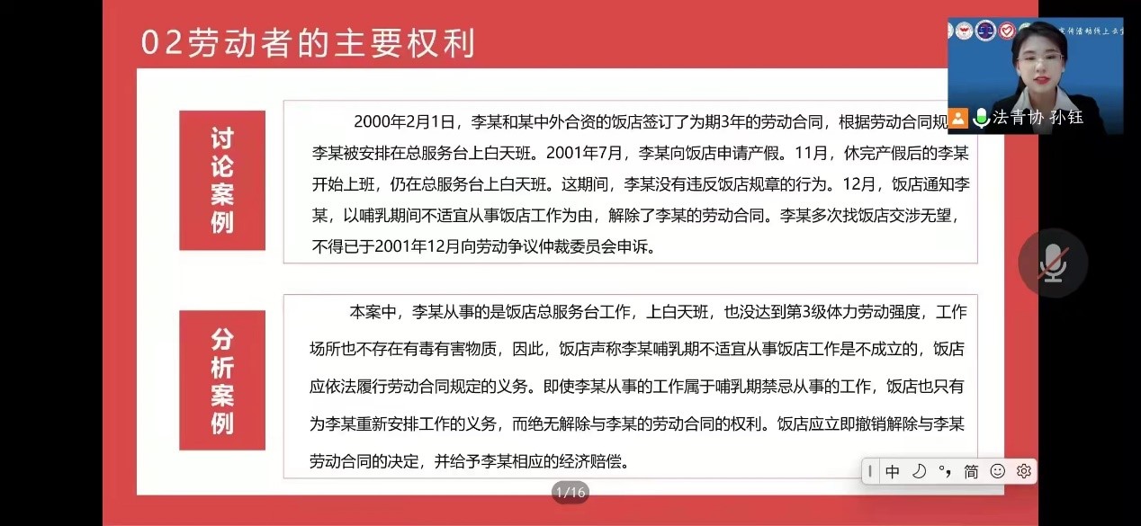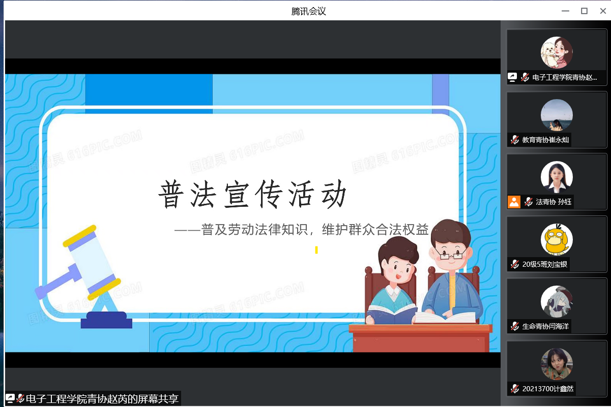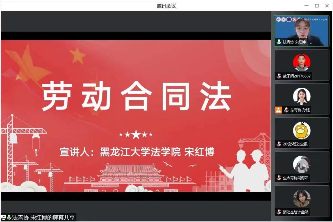 法律照进生活,智慧闪耀时代。为加强法律法规意识,增强自我防范。5月25日下午,由公海赌赌船官网jc710青年志愿者协会主办、五院联合共同举办的线上云宣讲“普及劳动法律知识,维护群众合法权益”普法宣传活动取得了圆满成功。