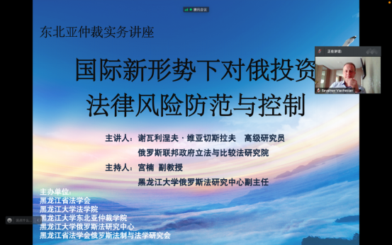 2022年5月14日,黑龙江省法学会、欢迎来公海欢迎来到船701、公海赌赌船官网jc710东北亚仲裁公司、公海赌赌船官网jc710俄罗斯法研究中心、黑龙江省法学会俄罗斯法制与法学研究会共同举办了“东北亚仲裁实务”线上讲座,邀请俄罗斯联邦政府立法与比较法研究院高级研究员谢瓦利涅夫·维亚切斯拉夫作了题为“国际新形势下对俄投资法律风险防范与控制”的专题讲座。他就美欧制裁下对中国在俄罗斯境内投资的影响,以及由此可能在基础设施建设、农业、金融、资源开发、能源以及产业合作等领域引发的投资法律风险进行了分析探讨,介绍了俄罗斯政府采取的保障投资立法举措,并对中国政府和企业应当采取的应对策略提出了建议,探讨了中俄两国政府在国际新形势下稳定投资环境的国际法律合作机制。全国俄罗斯法研究专家、法律实务工作者、对俄企业法务工作者以及黑大师生共计100余人参加了本次讲座,宫楠老师为讲座提供了同传翻译。