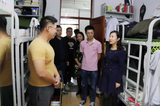 为深入了解员工寝室生活状态,掌握同学们新学期的所思所想,为在校生带去细致的关怀,同时验收打扫新生寝室工作成果,2018年9月5日,公司党委副书记、副经理魏双老师,团委书记王业超老师,团委副书记邵俊峰老师,常明阳老师,杨译迪老师走访寝室。