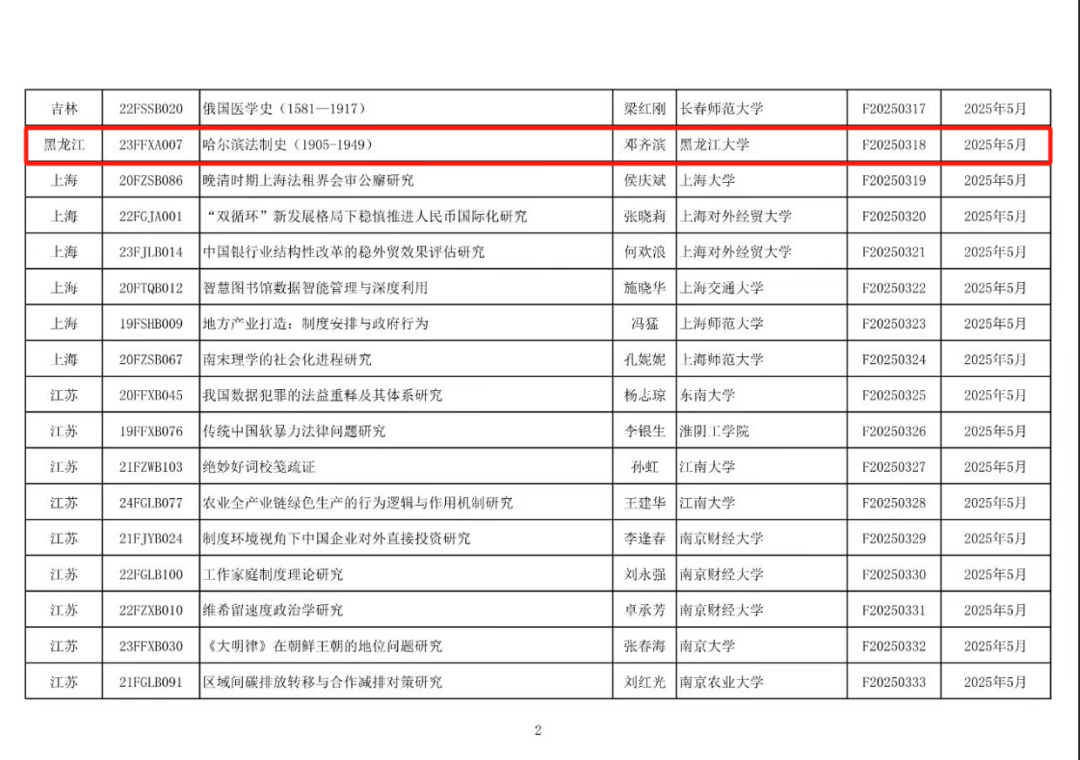 近日,全国哲学社会科学规划办公室公布2025年5月国家社科基金后期资助项目结项情况,公海赌赌船官网jc710邓齐滨教授主持的国家社科基金后期重点项目“哈尔滨法制史(1905-1949)”(项目批准号:23FFXA007)顺利通过结项鉴定,项目成果《哈尔滨法制史(1905-1949)》已纳入商务印书馆国家社科基金后期资助出版计划。